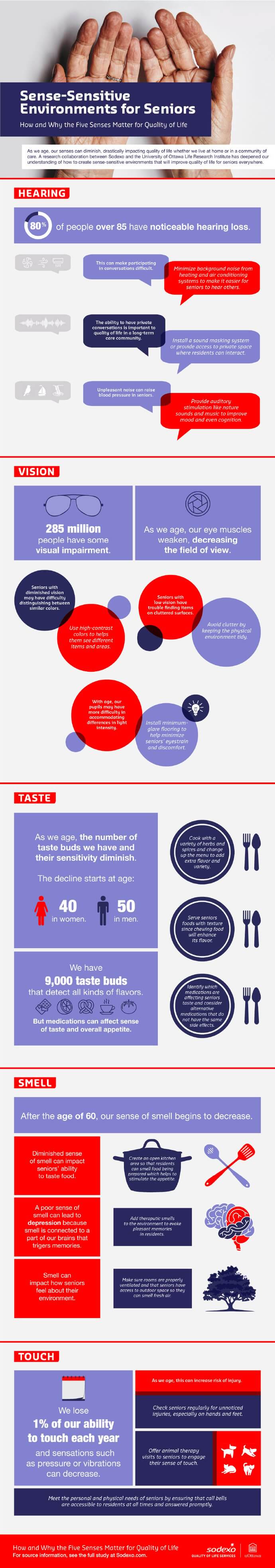 Une personne dépourvue de l'un de ses sens peut ne pas être capable de participer à des activités sociales ou d'accomplir les tâches banales du quotidien. C'est dans cet esprit que l'Institut Sodexo pour la Qualité de Vie s'est donné pour mission d'étudier les impacts des déficiences sensorielles afin de s'assurer que nous fournissons des services et des cadres de vie qui font une différence réelle et durable pour les résidents du monde entier. L'étude, menée en partenariat avec l'Institut de recherche sur la vie de l'Université d'Ottawa, s'est penchée sur la façon dont les lieux pourraient être conçus ou adaptés pour être plus "sensibles aux sens".