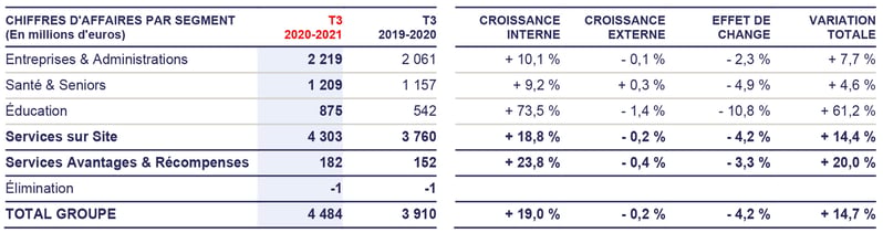 - La croissance interne du chiffre d’affaires des Services sur Site est de + 18,8 %, reflétant la reprise significative par rapport aux premiers confinements de mars 2020, avec un fort redémarrage des services de restauration en hausse de + 26 %, tandis que la croissance des services de Facilities Management, plus résilients, s’accélère à + 11 %.