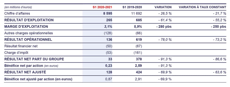 Les coûts de restructuration représentent 107 millions d'euros, après 158 millions d'euros au 2nd semestre 2019-2020. Les 85 millions d'euros restants devraient être passés en charge au 2nd semestre de l’exercice. - Le résultat net publié est positif, à 33 millions d'euros, et le BPA s’élève à 0,23 euro, tous deux en baisse de - 91,3 % par rapport au 1er semestre de l’exercice précédent. Le résultat net ajusté s’élève à 128 millions d'euros, contre 424 millions d'euros pour le 1er semestre 2019-2020 avant crise.
