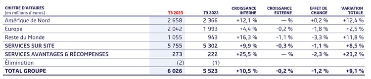 « L'activité sur site au troisième trimestre a continué de croître fortement, et ce malgré une base de comparaison nettement plus élevée. La dynamique commerciale reste bonne, tant en termes de gains de contrats que de fidélisation. La montée en puissance post-Covid s’est poursuivie, portée par davantage de retours dans les bureaux et une augmentation de la fréquentation des événements et du panier moyen.