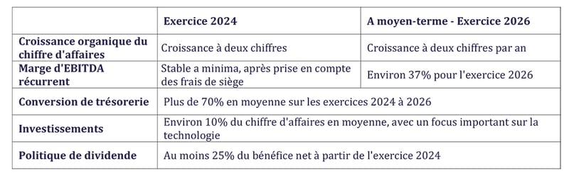 Les objectifs financiers de Pluxee pour les exercices fiscaux 2024 et 2026 visent à générer une croissance organique durable de son chiffre d’affaires, améliorer sa marge d’EBITDA récurrent et maintenir un niveau élevé de conversion de trésorerie.