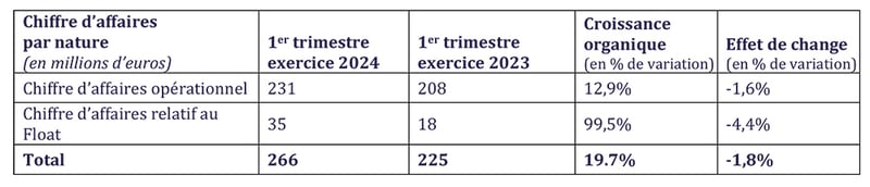 Le chiffre d’affaires total s’élève à 266 millions d’euros, en croissance organique de 19,7%, légèrement impacté par des effets de change en relation notamment avec le traitement comptable de la Turquie en hyperinflation. Le chiffre d’affaires opérationnel présente une solide croissance organique de 12,9%. Le chiffre d’affaires relatif au Float augmente de 99,5% en organique, principalement en raison de l’augmentation du Float ainsi qu’à la poursuite de la hausse des taux d’intérêt.