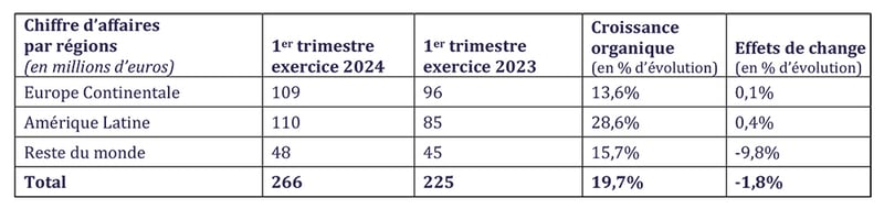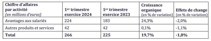 Le chiffre d’affaires des activités d’avantages aux salariés atteint 224 millions d’euros, générant une croissance organique de 24,3% par rapport à l’année précédente, principalement grâce une trajectoire dynamique des valeurs faciales, ainsi qu’à l’acquisition de nouveaux clients et à la croissance du portefeuille. Les autres produits et services génèrent un chiffre d’affaires de 42 millions d’euros, stable par rapport au 1er trimestre de l’exercice 2023 du fait d’une base de comparaison élevée dans les contrats d’aide publique.