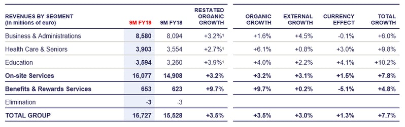 Organic revenue growth for the First Nine Months Fiscal 2019, at +3.5%, was better than expected, resulting from another encouraging performance in the third quarter up +4.2%, with growth improving in all On-site services segments in North America. Growth remains solid outside North America, and in Benefits & Rewards Services.2018 first nine months revenues amounted to 15.5 billion euro, down -2.9%. During the period, the currency impact was -6.6% due to the weakness of the U.S. dollar and the Brazilian real in particular. Net acquisitions contributed +2.2% during the nine months, accelerating in the third quarter, with Centerplate contributing for the full quarter. Organic revenue growth was +1.6%. This growth was made up of +1.5% for On-site Services and +4.2% for Benefits & Rewards Services.